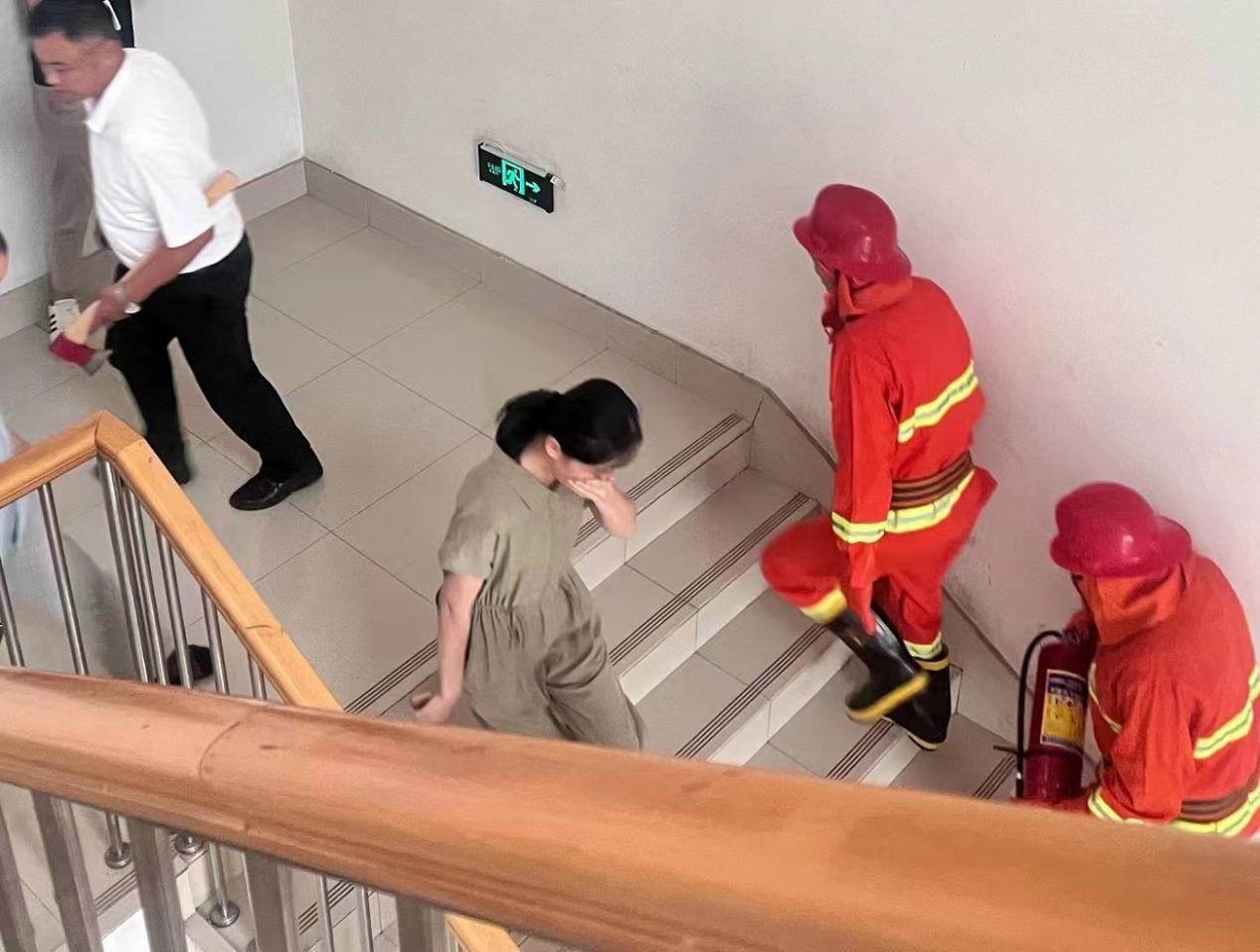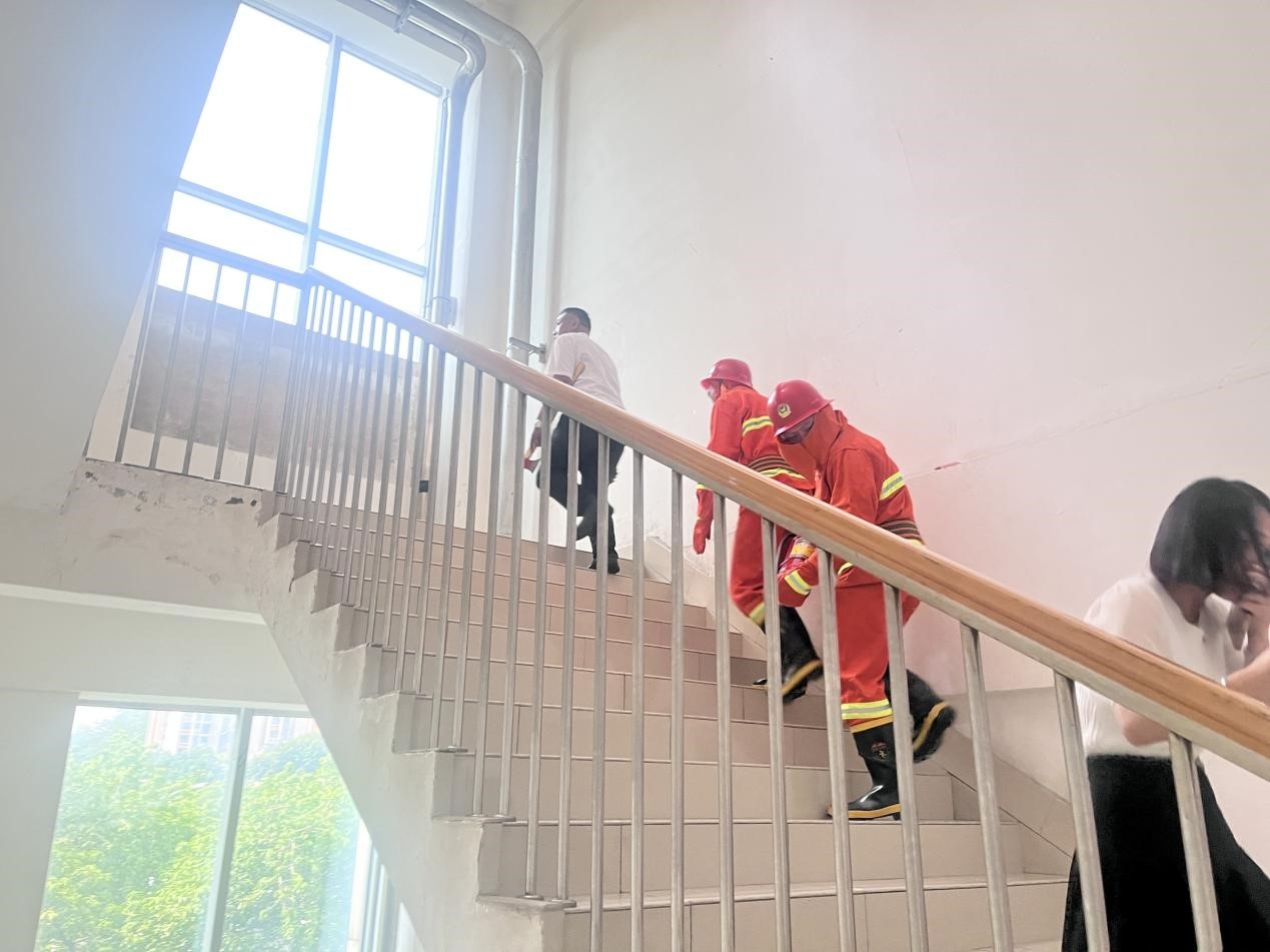園區(qū)消防人員迅速上樓至起火樓層進行滅火行動。